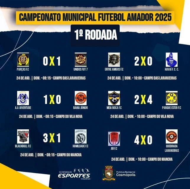 A bola rolou neste domingo (24) pela 1ª rodada do Campeonato Municipal de Futebol Amador 2025, com duelos emocionantes nos campos da cidade.