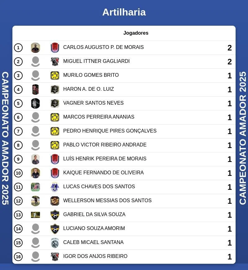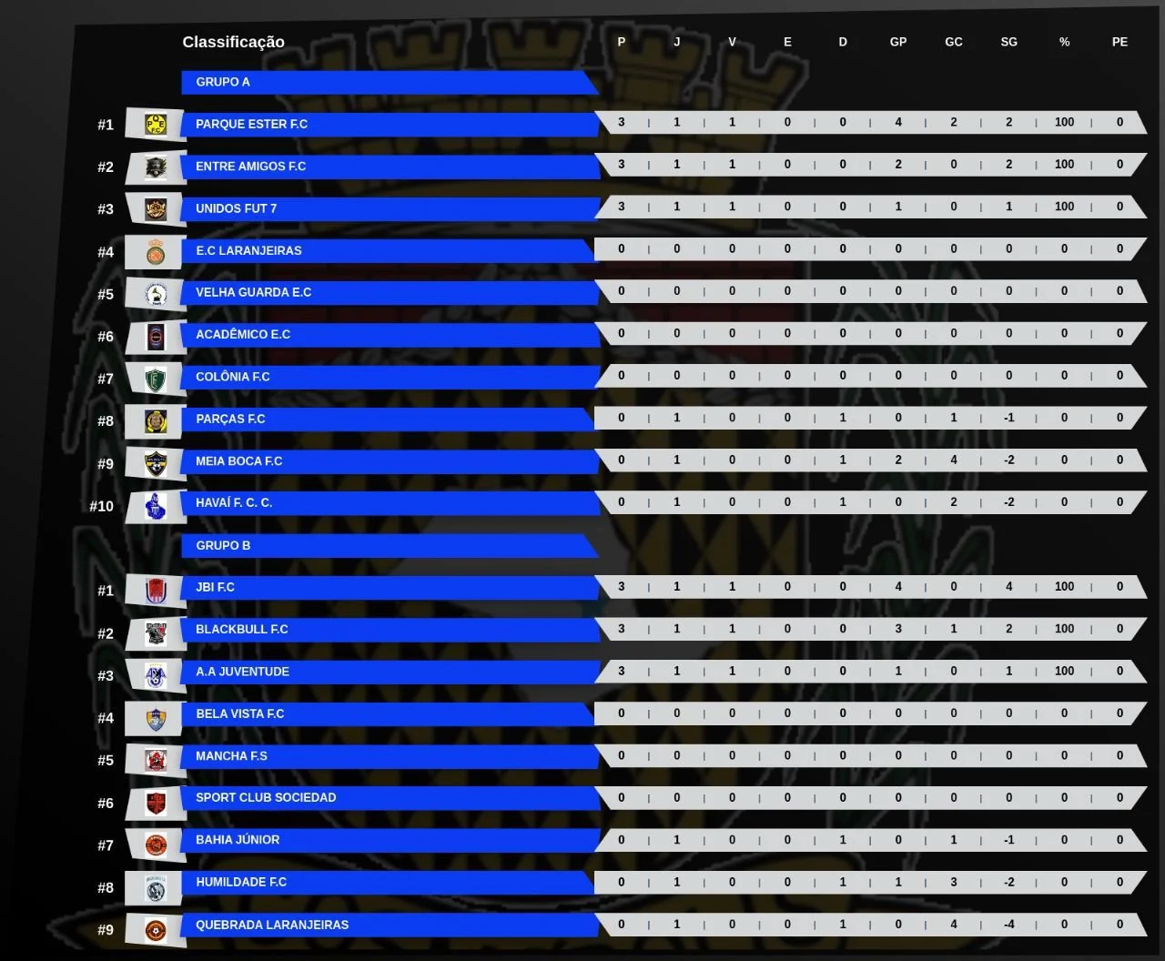 Na artilharia, Carlos Augusto P. de Morais (JBI FC) e Miguel Ittner Gagliardi (Blackbull FC) se destacam, cada um com dois gols. A competição promete fortes emoções na próxima etapa que acontece neste domingo (31).