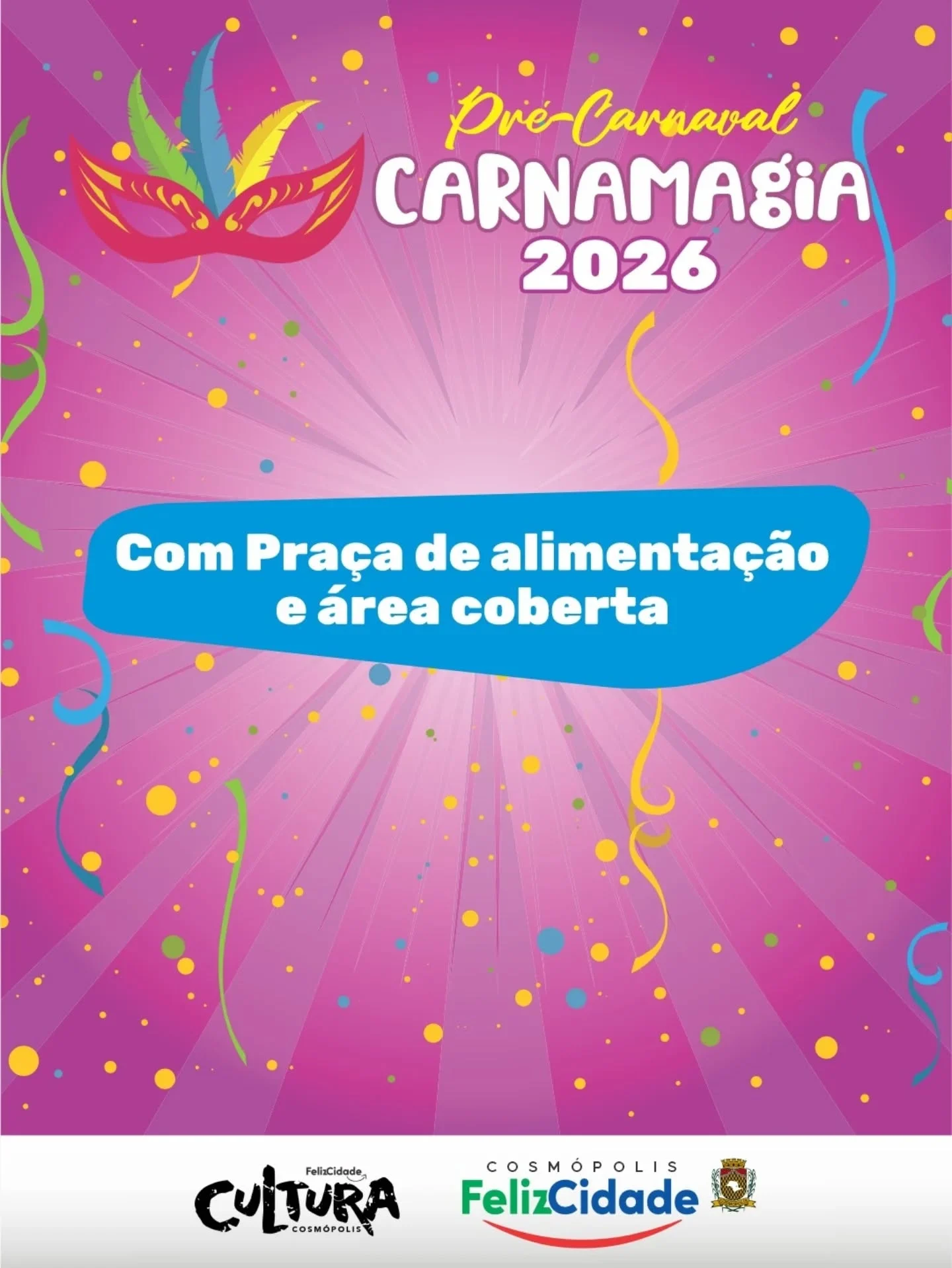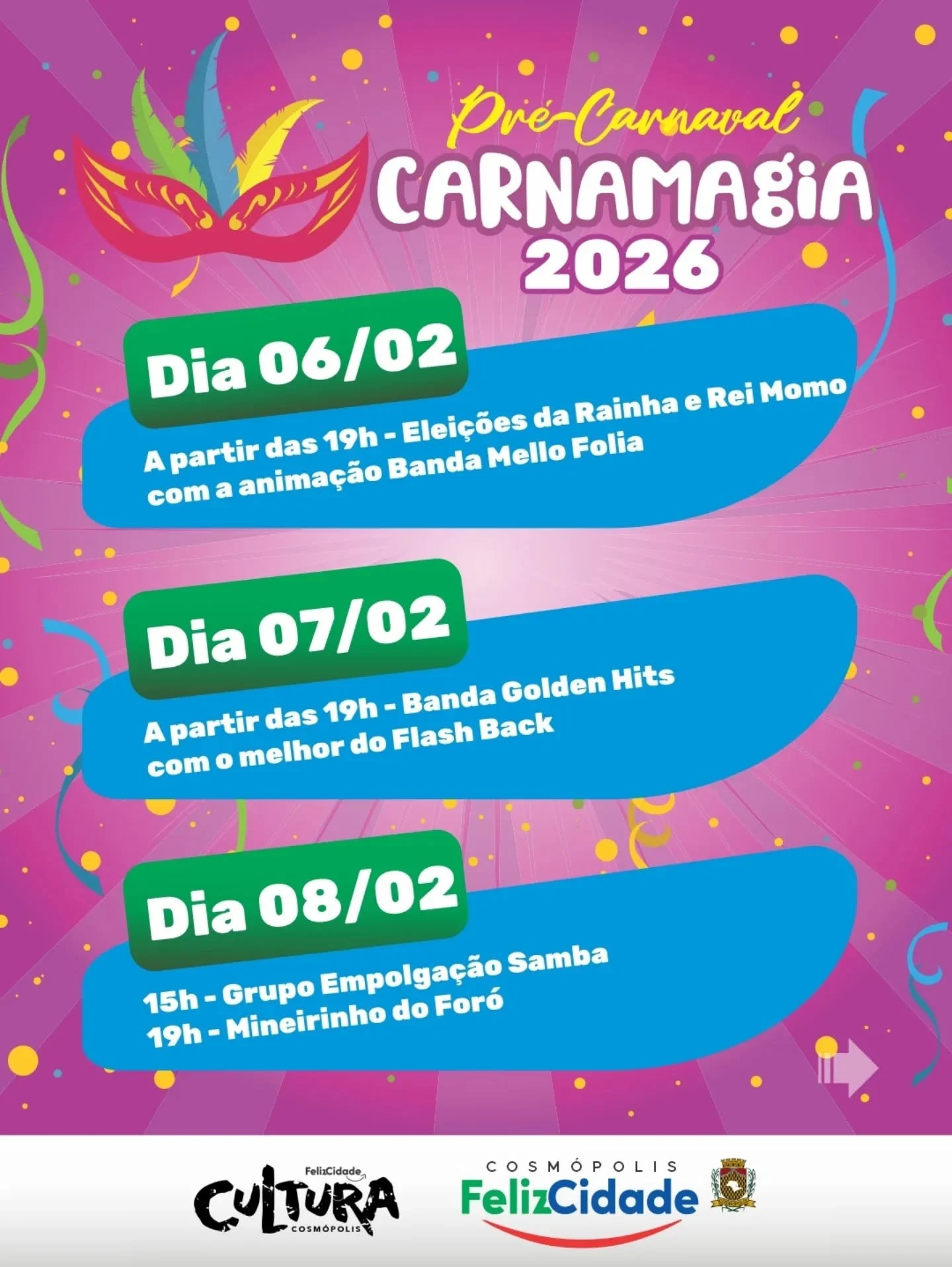 A Prefeitura de Cosmópolis convida toda população para a programação oficial de pré-carnaval, que acontece de 6 a 8 de fevereiro, na Praça do Rodrigo. A festa começa no dia 6 com o tradicional Concurso da Rainha e do Rei Momo, celebrando a alegria, a cultura e a tradição carnavalesca da cidade. Serão dias de música, animação e convivência para toda a família, marcando o início das comemorações do Carnaval em Cosmópolis.