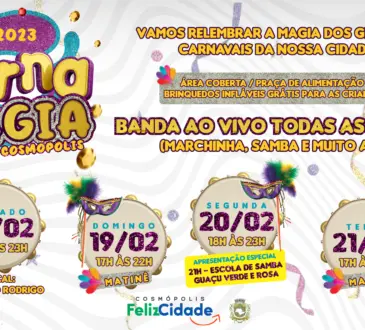 Nos dias 02 a 05/02, acontece o ‘Festival Cultural e Gastronômico de Cosmópolis’ e ‘2ª Festival de Torresmo’, realizado na Praça Presidente Kennedy, popular ‘Praça do Rodrigo’. O evento tem o ...