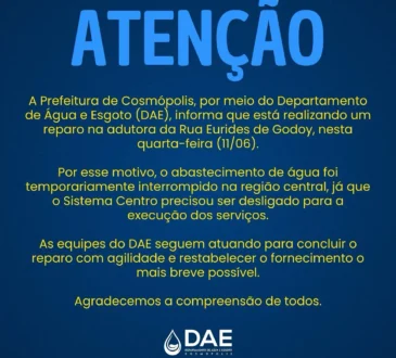 Nesta quarta-feira (11/06), o DAE está realizando um reparo na adutora da Rua Eurides de Godoy. Por conta disso, foi necessário interromper temporariamente o abastecimento de água na região central, com o ...