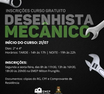 Atenção, Cosmópolis! Estão abertas as inscrições para o curso gratuito de Desenhista Mecânico, com início no dia 21 de julho. Aulas às segundas e quartas-feiras Horários: • Tarde: 14h às 17h • ...