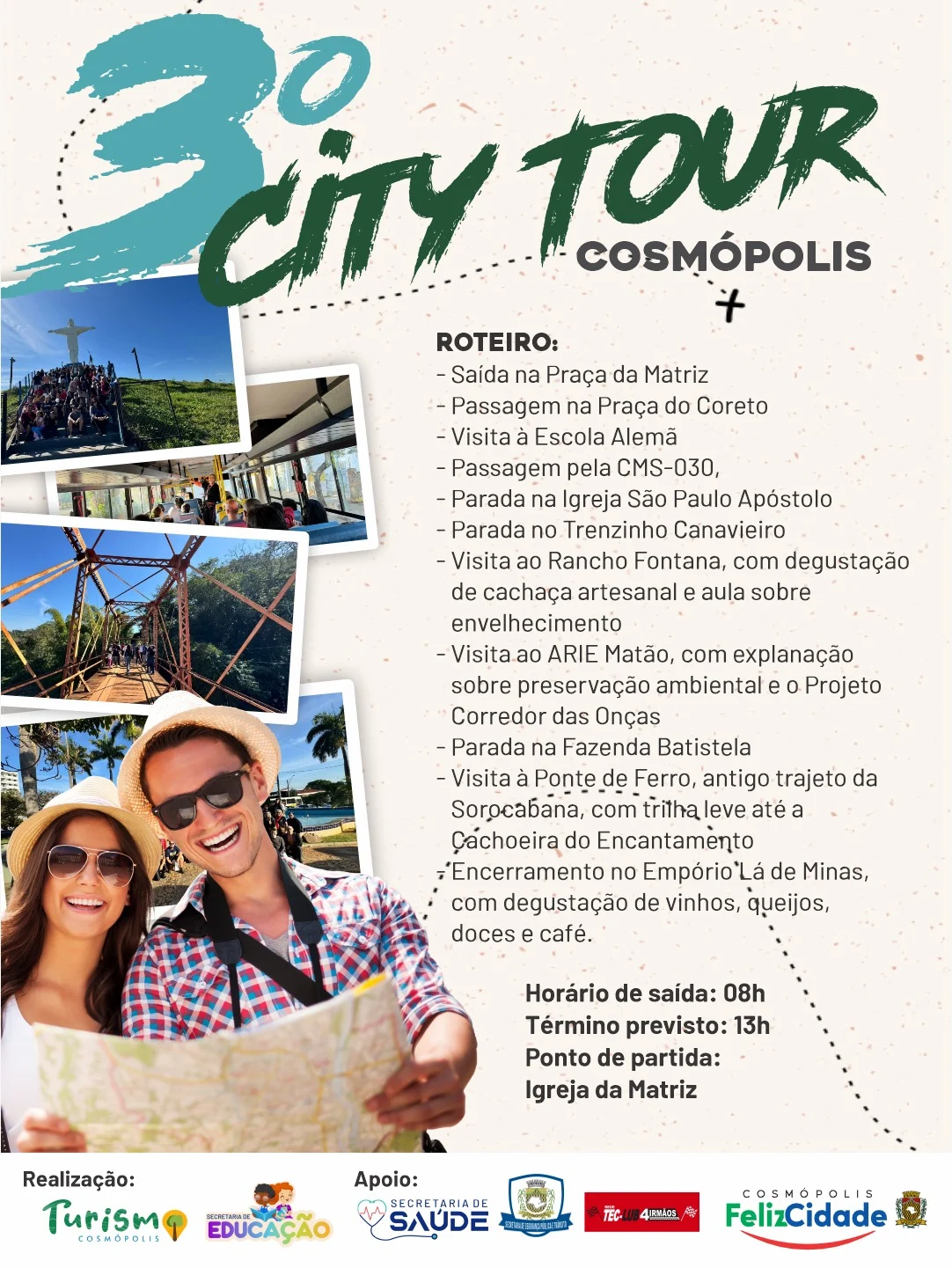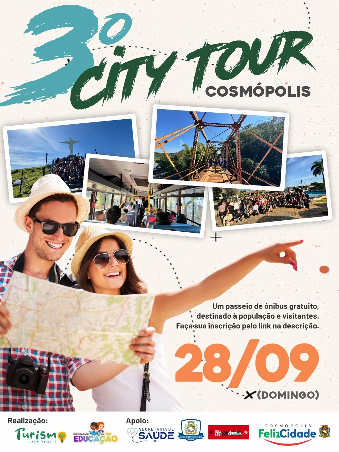 Após o sucesso das duas primeiras edições, vem aí o 3º City Tour de Cosmópolis, um passeio gratuito de ônibus destinado à população e visitantes no dia 28 de Setembro.
