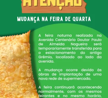 A tradicional feira noturna de quarta-feira mudou de endereço a partir do dia 23 de abril. Agora, ela será realizada no estacionamento do antigo Grêmio, ao lado da Avenida Centenário Dr. Paulo de Almeida ...