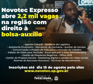 O Governo do Estado de São Paulo, por meio da Secretaria de Desenvolvimento Econômico, abriu inscrições para 2.220 vagas em cursos de qualificação profissional do programa Novotec Expresso na região. Os ...