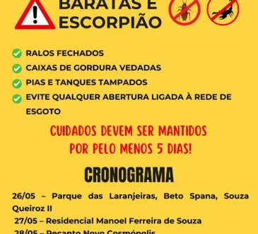 A partir desta segunda-feira (26/05), a Prefeitura de Cosmópolis inicia um novo ciclo do controle químico nos poços da rede de esgoto, com foco no combate a baratas e escorpiões. ATENÇÃO, MORADORES! ...
