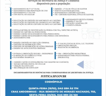 Cosmópolis recebe o Projeto Cidadania Itinerante, que leva diversos serviços gratuitos à população, facilitando o acesso a documentos, orientações e atendimentos essenciais em um só lugar. Quinta-feira ...