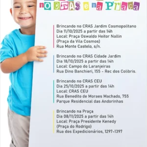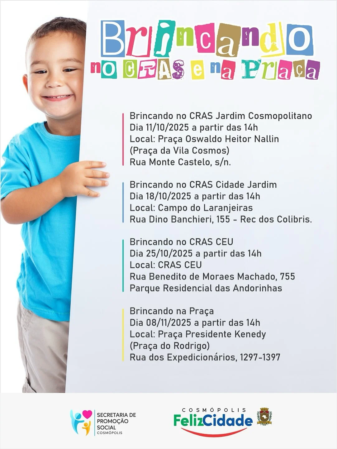 A Secretaria de Promoção Social de Cosmópolis promove em outubro e novembro novas edições do projeto Brincando no CRAS e na Praça. A iniciativa leva atividades recreativas e de convivência para diferentes bairros da cidade, sempre aos sábados, a partir das 14h.