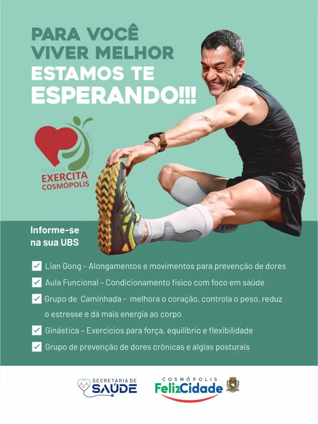A Prefeitura de Cosmópolis, por meio da Secretaria Municipal de Saúde, está oferecendo atividades gratuitas para todas as idades, com acompanhamento de monitores da saúde, educadores físicos e fisioterapeutas.