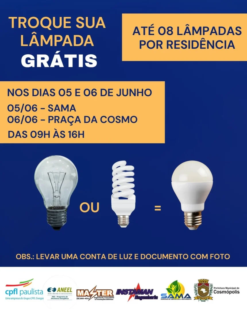 A CPFL Paulista, em parceria com a Prefeitura Municipal de Cosmópolis, por meio da Secretaria de Agricultura e Meio Ambiente, realizará nos dias 05 e 06 de junho, das 9h às 16h, a troca de lâmpadas fluorescentes e incandescentes por lâmpadas de LED.