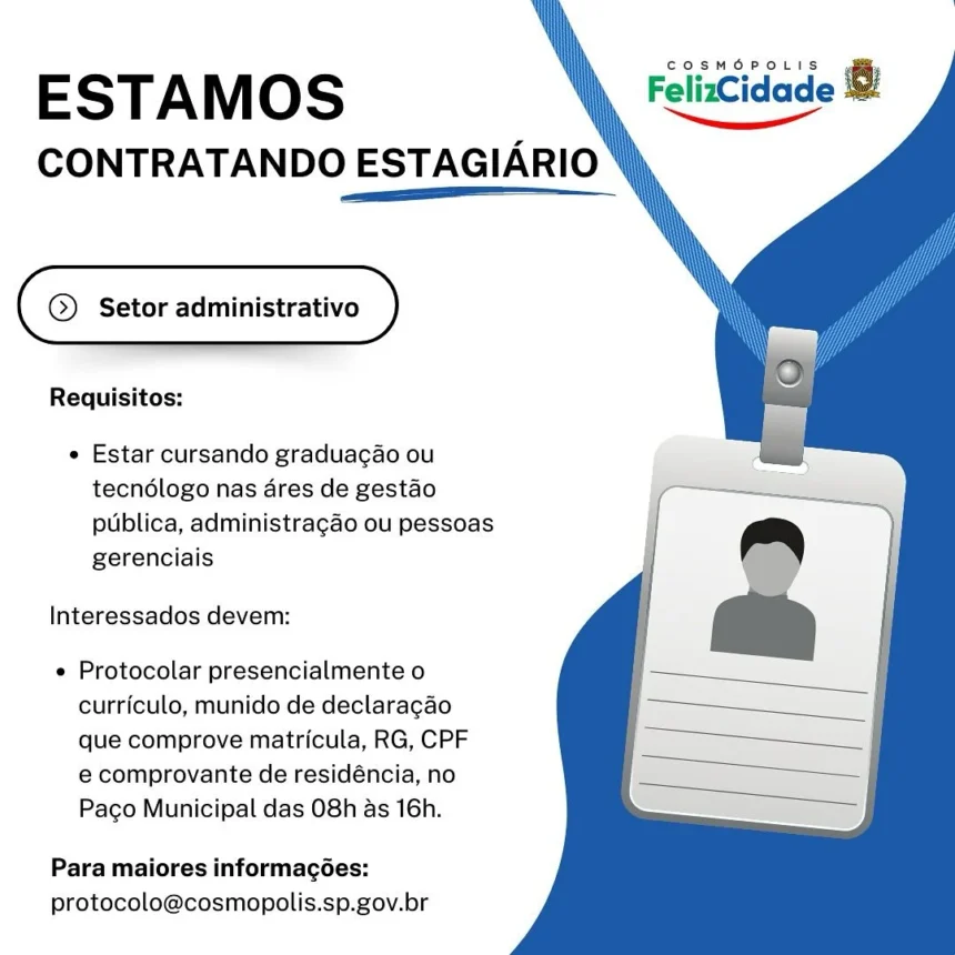 Vaga de estágio disponível! 7 de abril de 2025 Compartilhe Facebook Twitter LinkedIn WhatsApp E-mail Você também pode gostar Palestra sobre métodos contraceptivos SAÚDE 18 de novembro de 2025 Seguimos firmes no compromisso com o Planejamento Familiar Realizamos hoje a nossa palestra sobre métodos contraceptivos e também a passagem ... BOLETIM 207 BOLETIM INFORMATIVO 30 de novembro de 2025 Final do Campeonato Municipal de Futebol Amador 2025 ESPORTE 25 de novembro de 2025 A Prefeitura de Cosmópolis celebra a grande Final do Campeonato Municipal de Futebol Amador 2025, realizada em 23 de novembro, às 08h30, no ... Campanha de vacinação de gestantes contra o vírus sincicial respiratório no CSII SAÚDE 12 de dezembro de 2025 A Prefeitura de Cosmópolis iniciou hoje (11), no CSII, a vacinação de gestantes contra o vírus sincicial respiratório (VSR), importante ... Espetáculo “Odus”: Um Mergulho nas Lendas da Cultura Iorubá CULTURA 18 de novembro de 2025 O espetáculo “Odus”, promovido pelo grupo Histórias dos Odus, chega a Cosmópolis no dia 20 de novembro, levando a magia das ... Comunicado: funcionamentos dos serviços essenciais e administrativos UTILIDADE PÚBLICA 19 de novembro de 2025 Atenção! • As repartições que prestam serviços essenciais e de interesse público, com funcionamento ininterrupto, terão expediente ...
