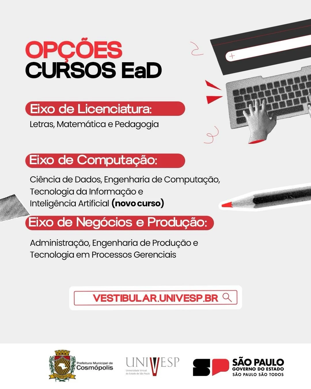 A Universidade Virtual do Estado de São Paulo (Univesp) abriu na segunda-feira (02/02), as inscrições para o Vestibular 2026, com 24.029 vagas gratuitas em 10 cursos, distribuídas em polos de centenas de municípios.